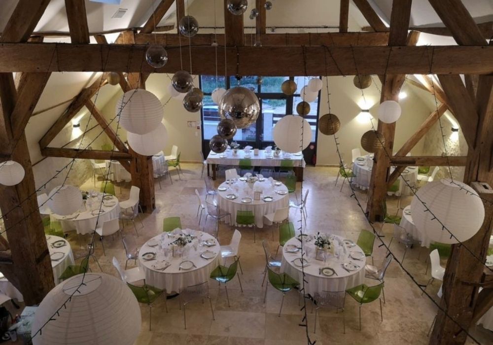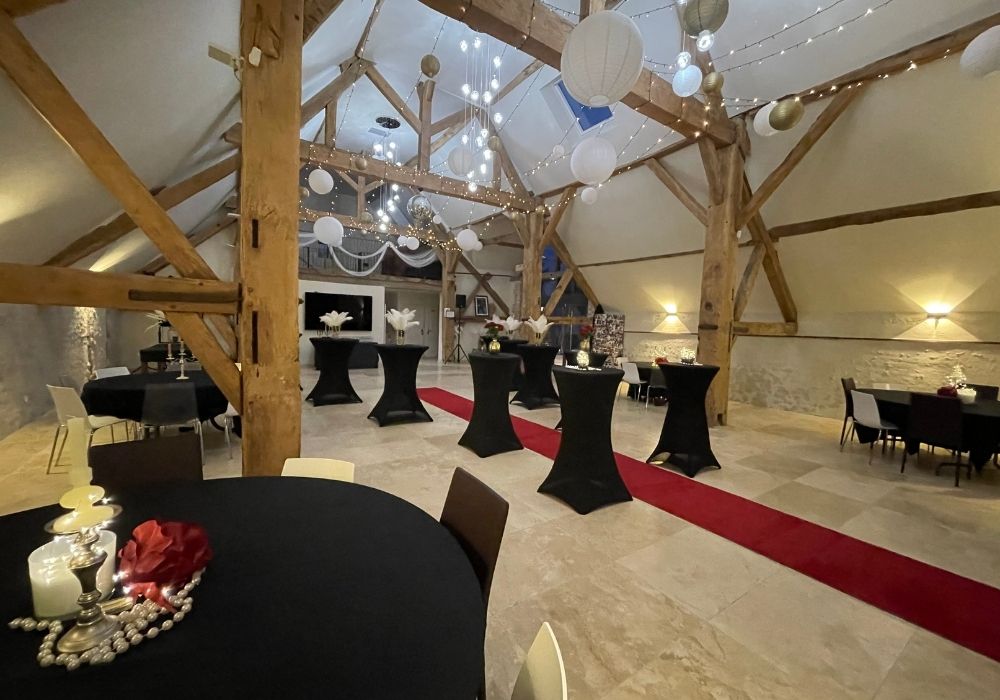 La salle de réception, entièrement climatisée, révèle une majestueuse charpente cathédrale en bois et pierre.