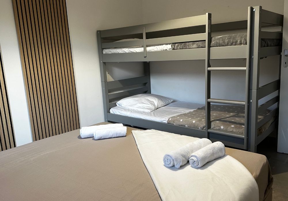 Les deux suites comportent des lits 160, une chambre comporte deux lits 90 réunissables la 4ème un lit double 160 et deux lits superposés, dans le séjour un canapé lit et un lit simple.